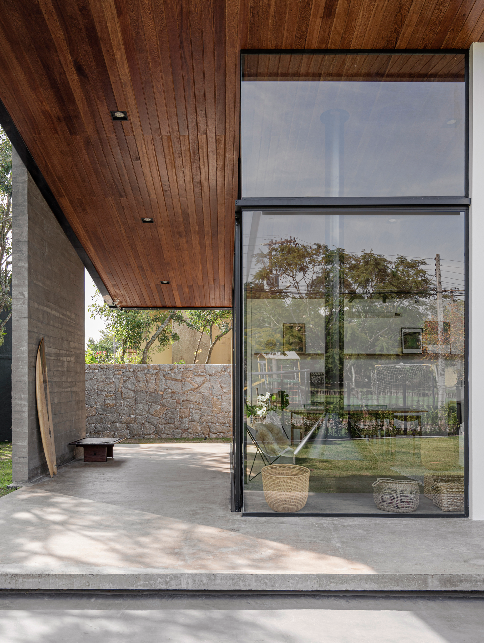 Na varanda, novamente, estão todos os elementos da materialidade natural da casa, madeira e concreto, vidro e pedra.