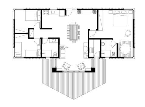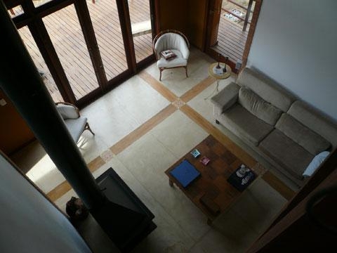A sala se estende por um deck elevado, graças ao desnível do terreno, de onde se descortinam os lagos no fundo do vale. Encoberto pelo deck, fica o acesso ao pequeno porão que abriga os equipamentos de lazer e manutenção e o depósito de lenha. Não se poderia intervir neste local sem uma atenção especial à preservação da natureza. O sistema de aquecimento de água aproveita o funcionamento do fogão à lenha, e paredes duplas em todo o contorno da casa fazem frente às temperaturas extremas, reduzindo o uso de aquecedores no inverno e garantindo frescor no verão.