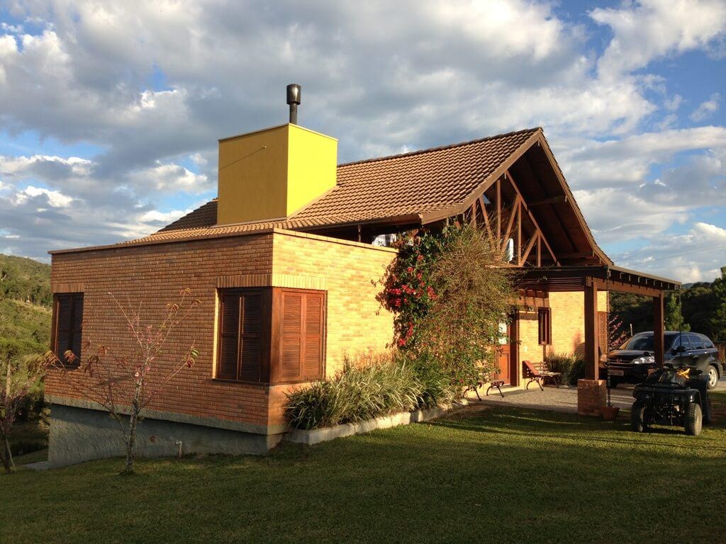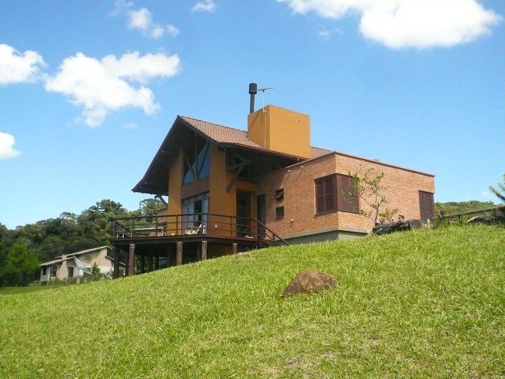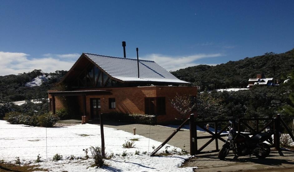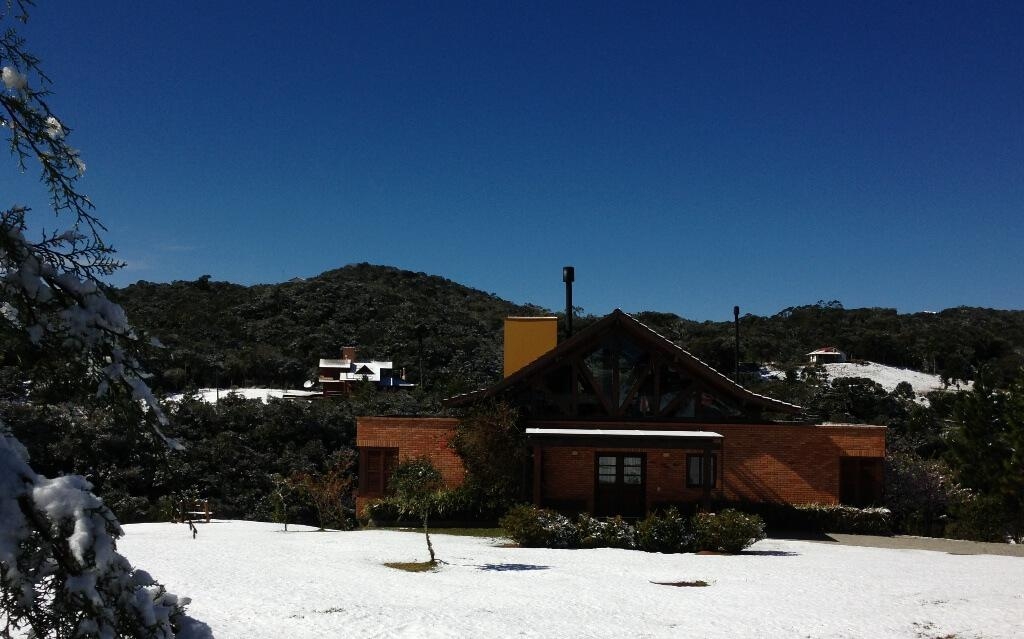 Foto feita em julho/13 durante neve que caiu em SC Um lugar para a família estar em contato com a natureza, num ambiente que ao mesmo tempo garantisse privacidade e permitisse desfrutar da bela cena campestre: era preciso uma arquitetura contextualizada, que se encaixasse na paisagem e na cultura da região. Projetar uma casa fora da cidade num terreno amplo, cercado de linda paisagem é um desafio que começa na definição do posicionamento da casa no terreno.