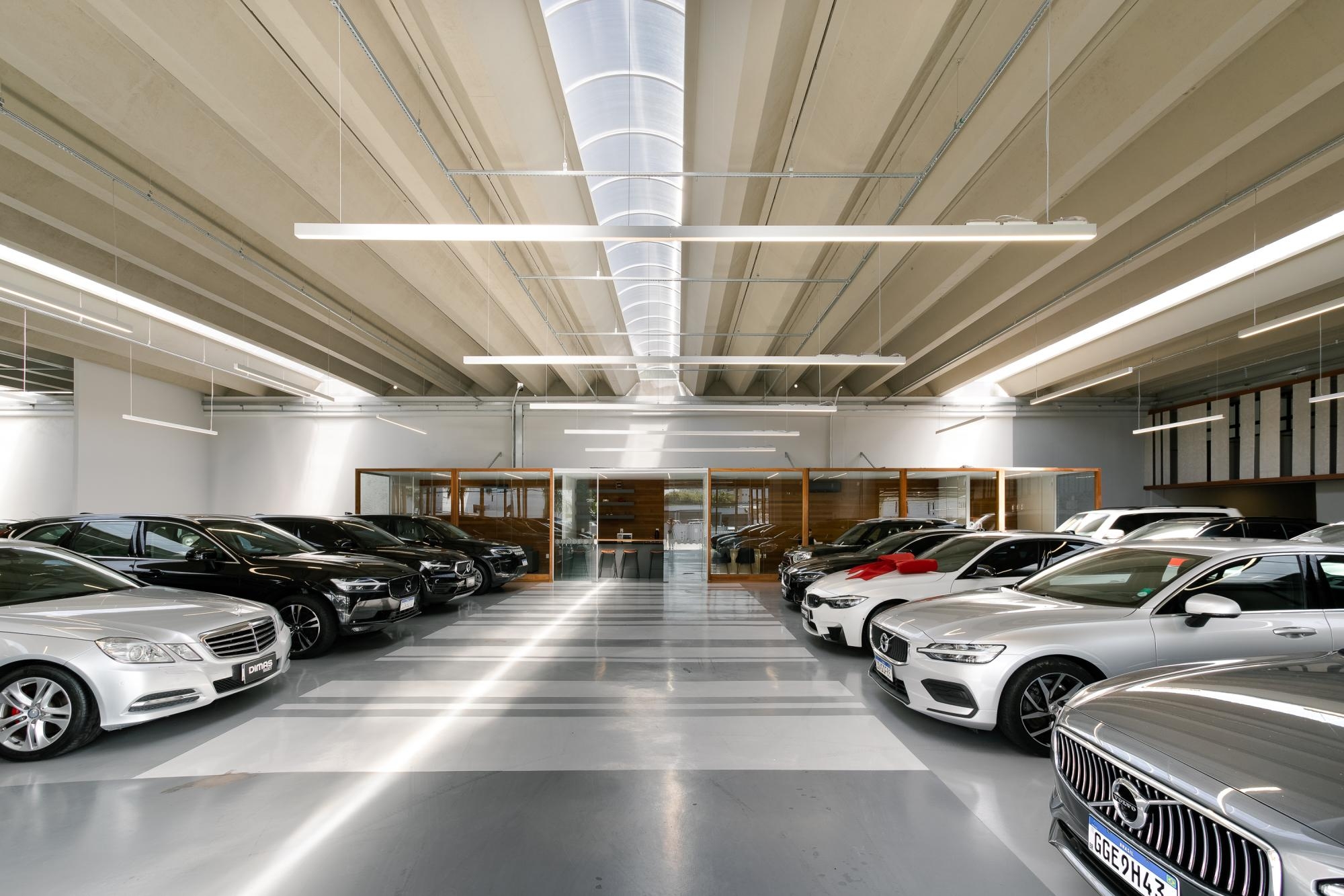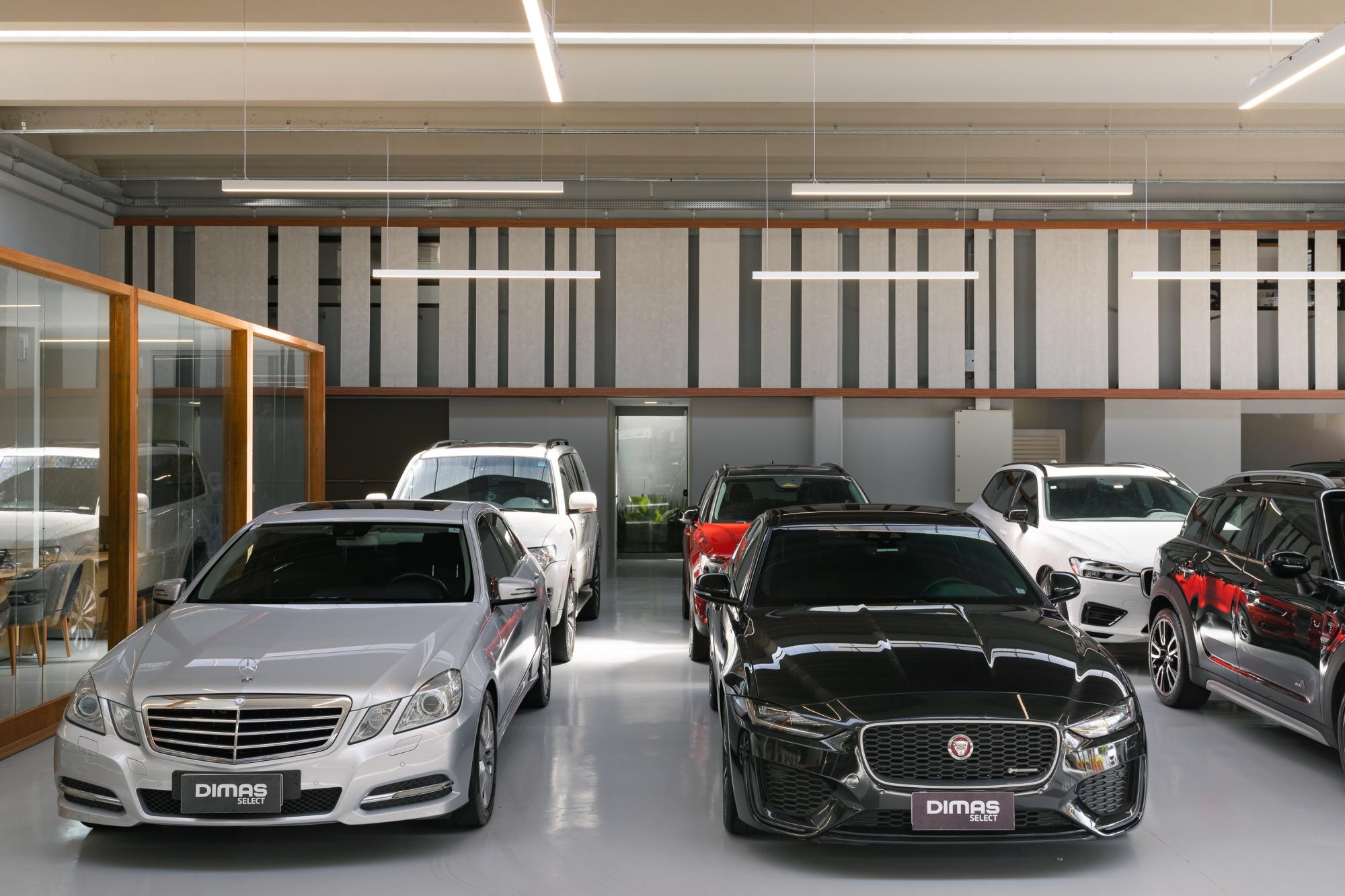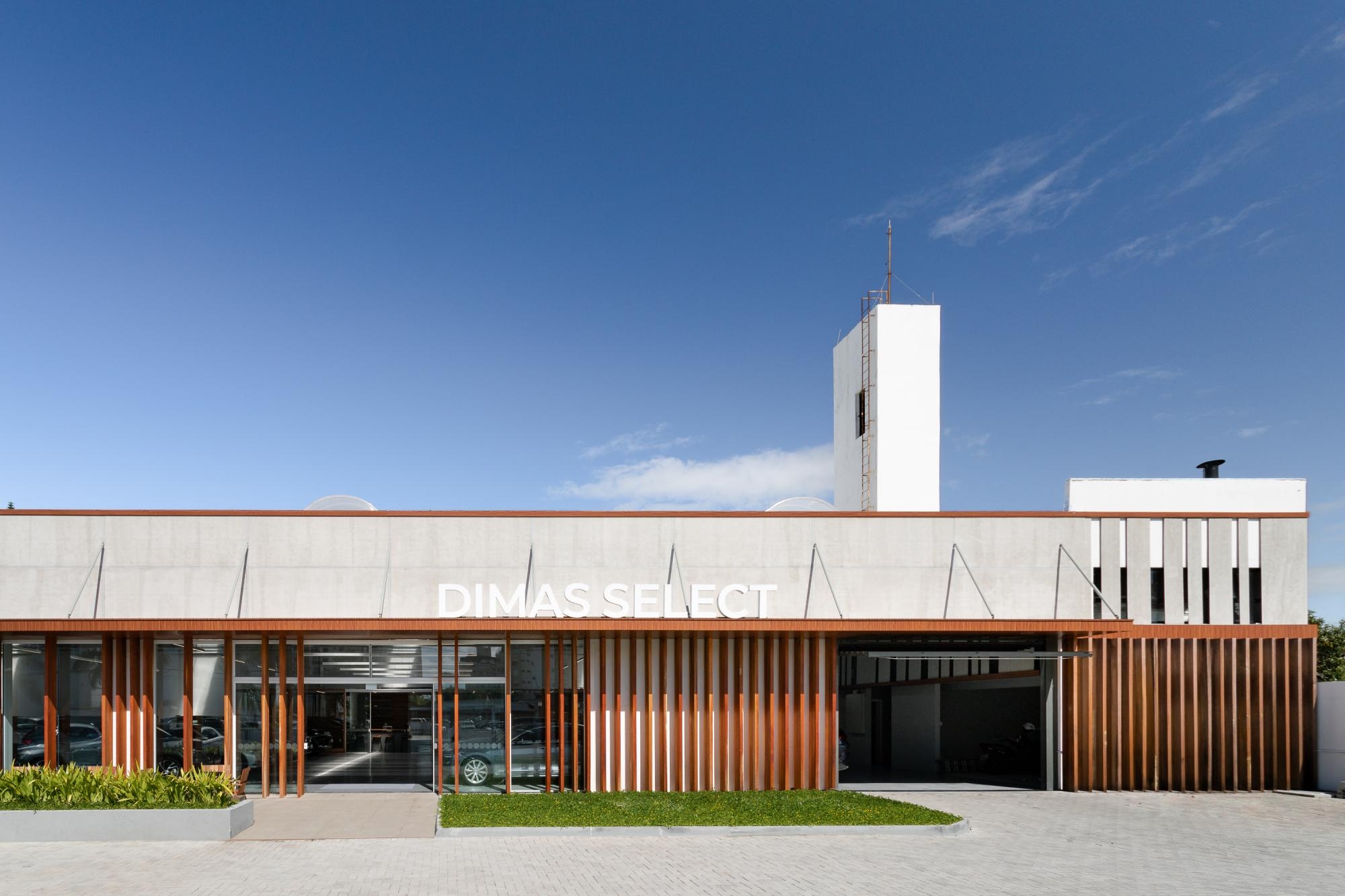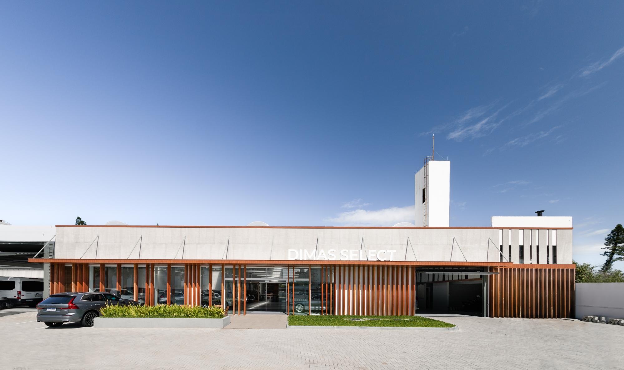 Dentro dessa ressignificação, desenhamos a Dimas Select, espaço da nova marca do Dimas Automóveis, voltada para automóveis semi novos de alto padrão. Uma nova loja, com personalidade própria estampada desde a fachada, que qualifica a desejada transparência com o ritmo das linhas, dos cheios e vazios.