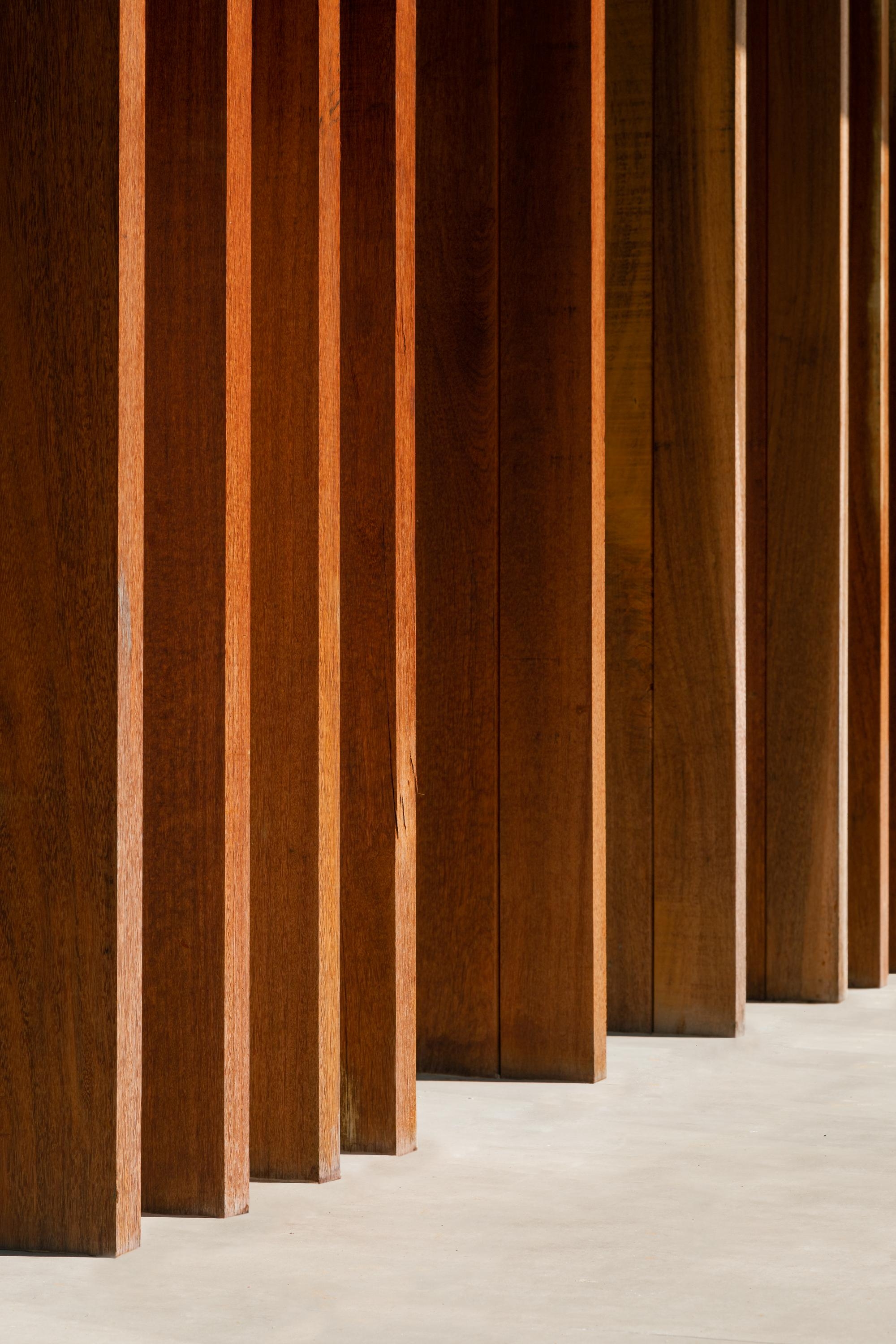 A madeira, escolhida para materializar o desenho da fachada da loja, faz a ponte entre a tecnologia e o acolhimento criando uma pele sobre a fachada de vidro, feita de painéis reaproveitados de outras lojas.
