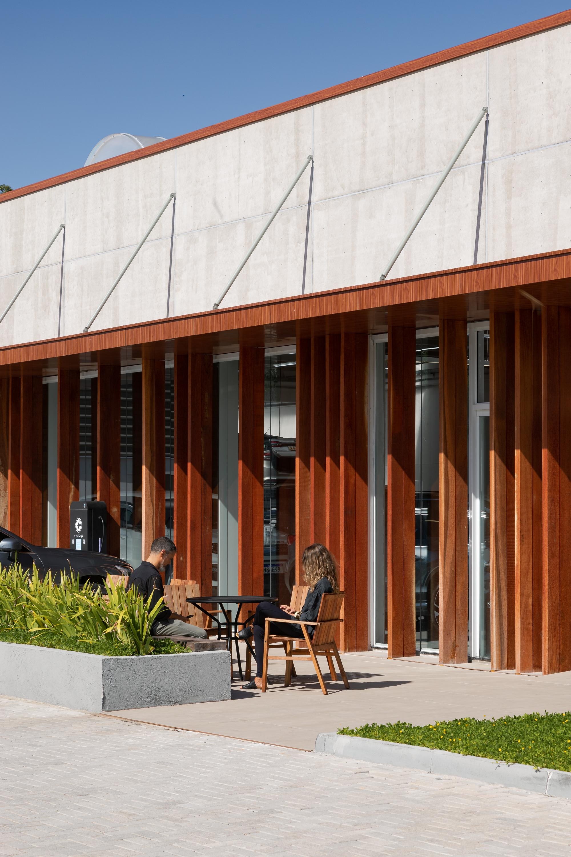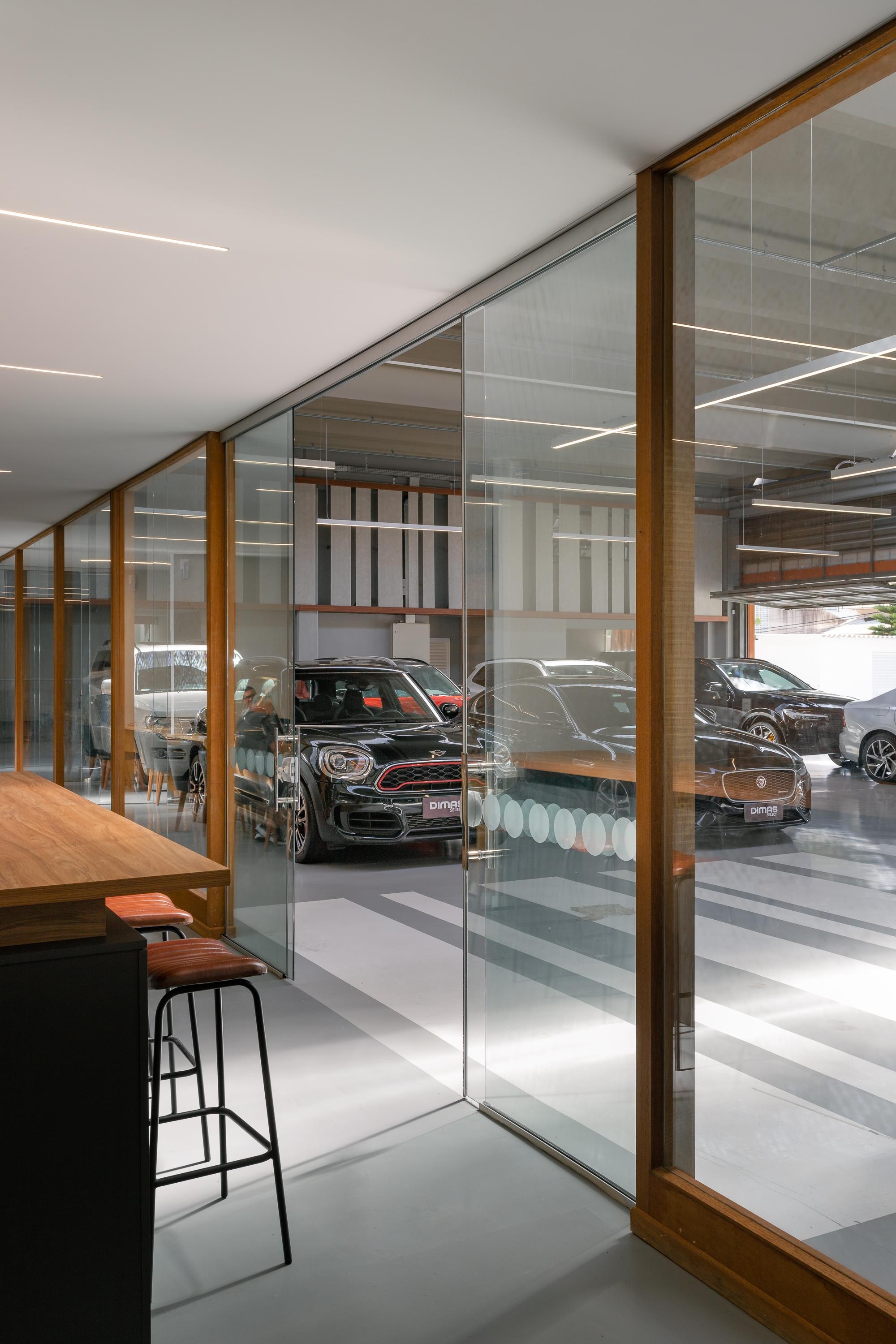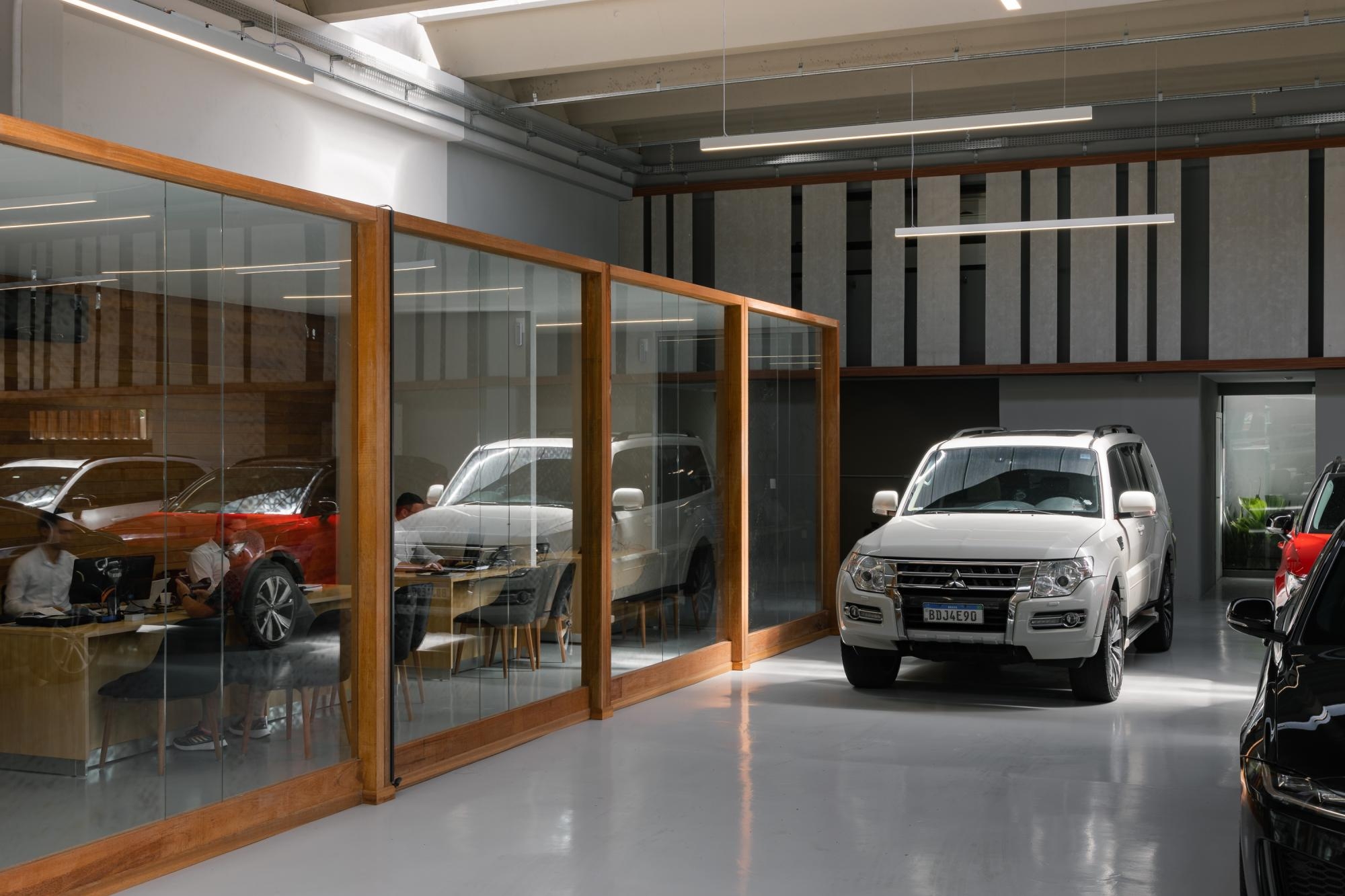 Dentro do pavilhão monocromático onde os carros se destacam, novamente a madeira faz o contraponto, estruturando e enquadrando as áreas de acolhimento e atendimento