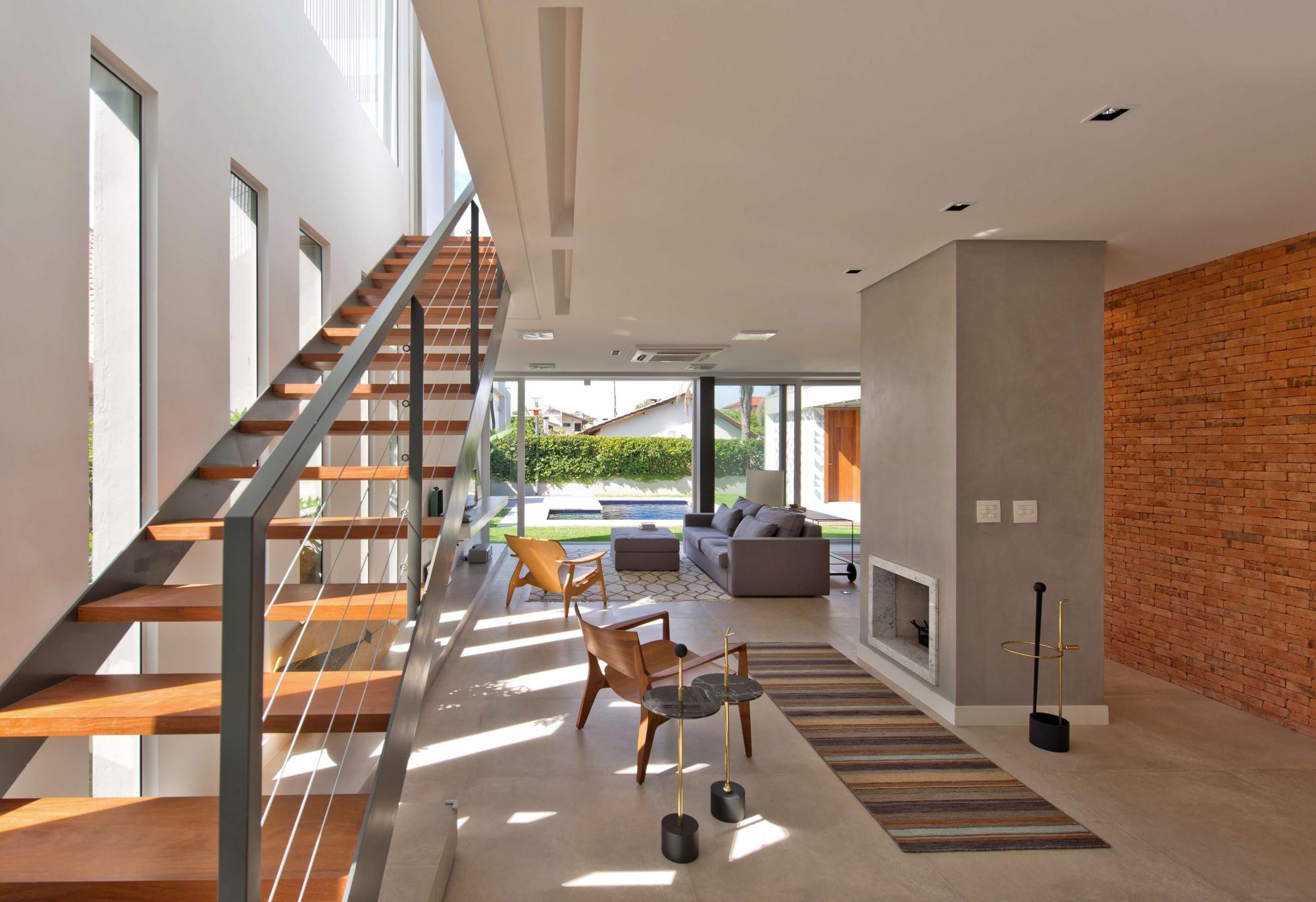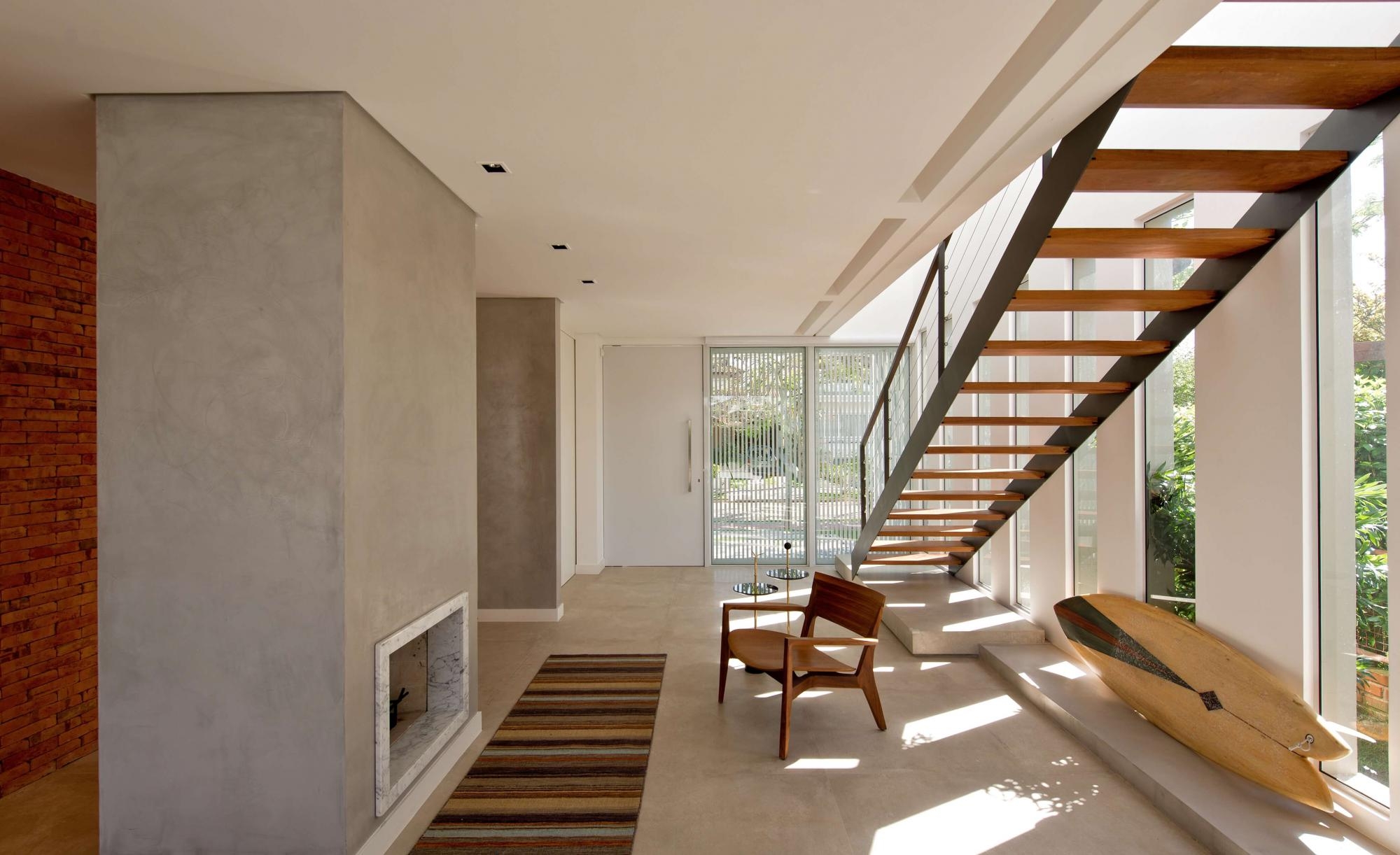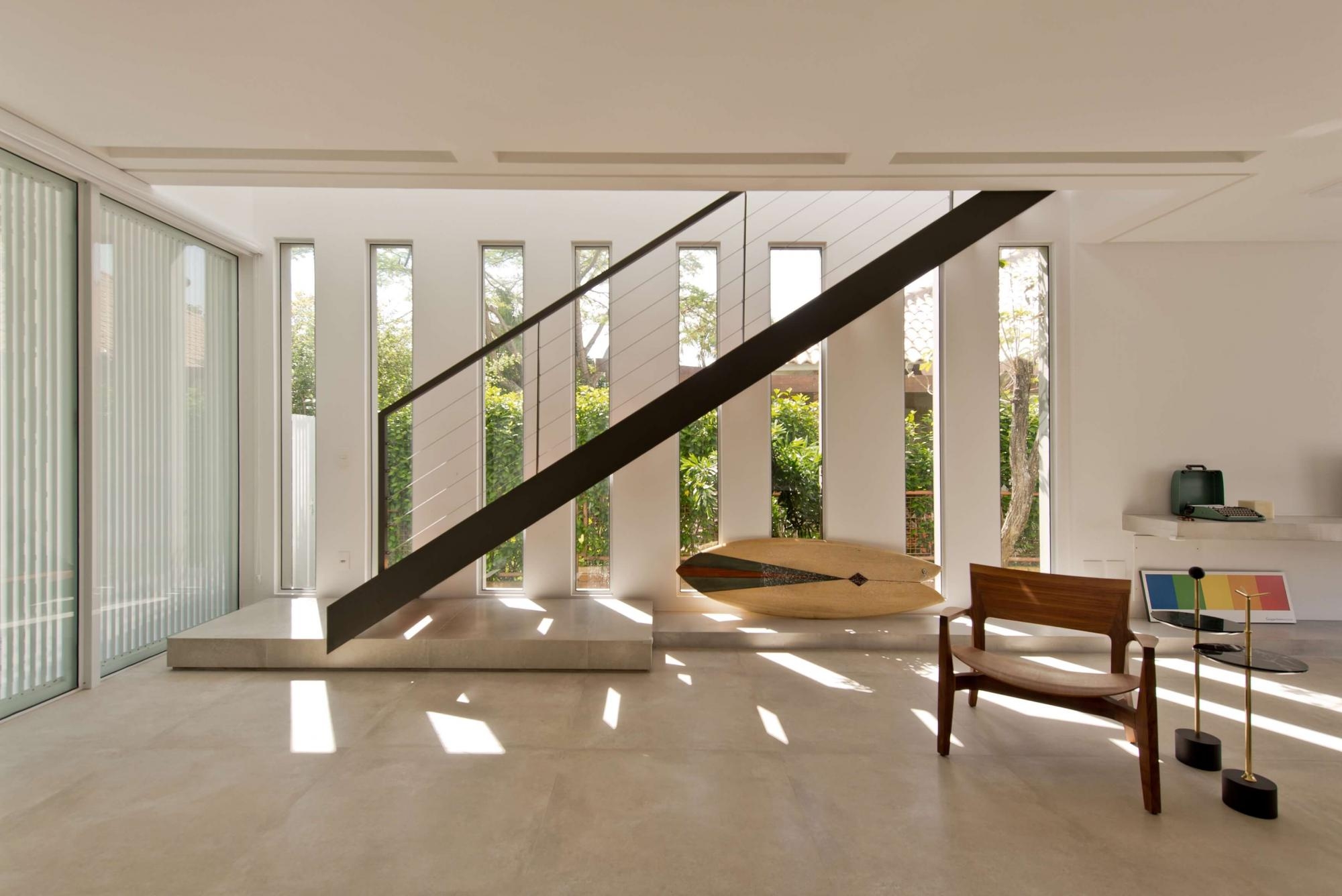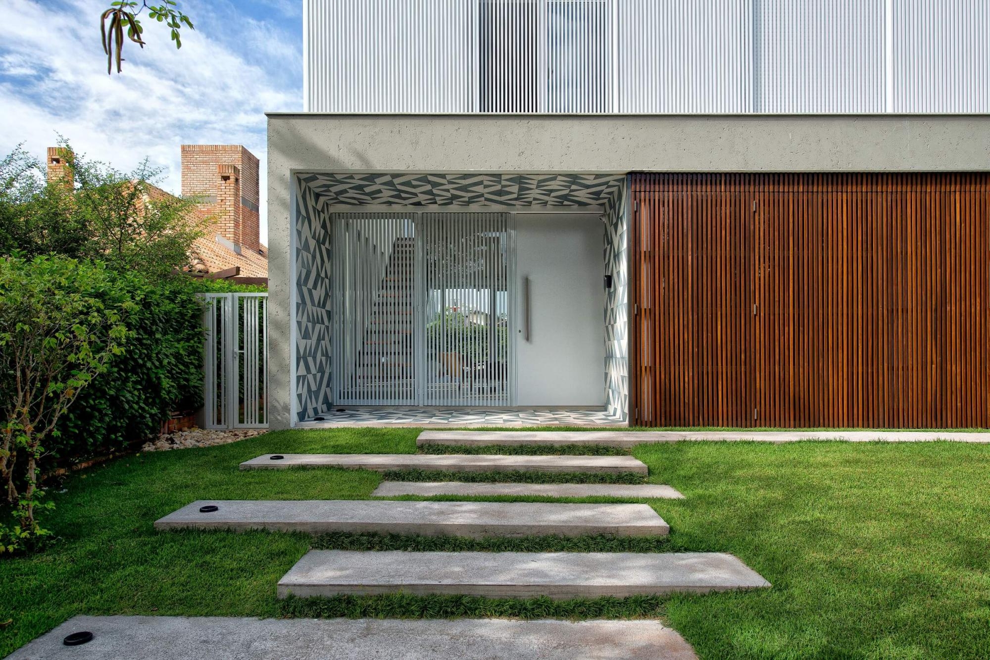 Eles foram localizados no piso superior, dentro de uma caixa envolvida por um sistema de ripas metálicas que a destaca do restante da casa e dá privacidade às janelas dos quartos, filtrando quando necessário a insolação desejada.