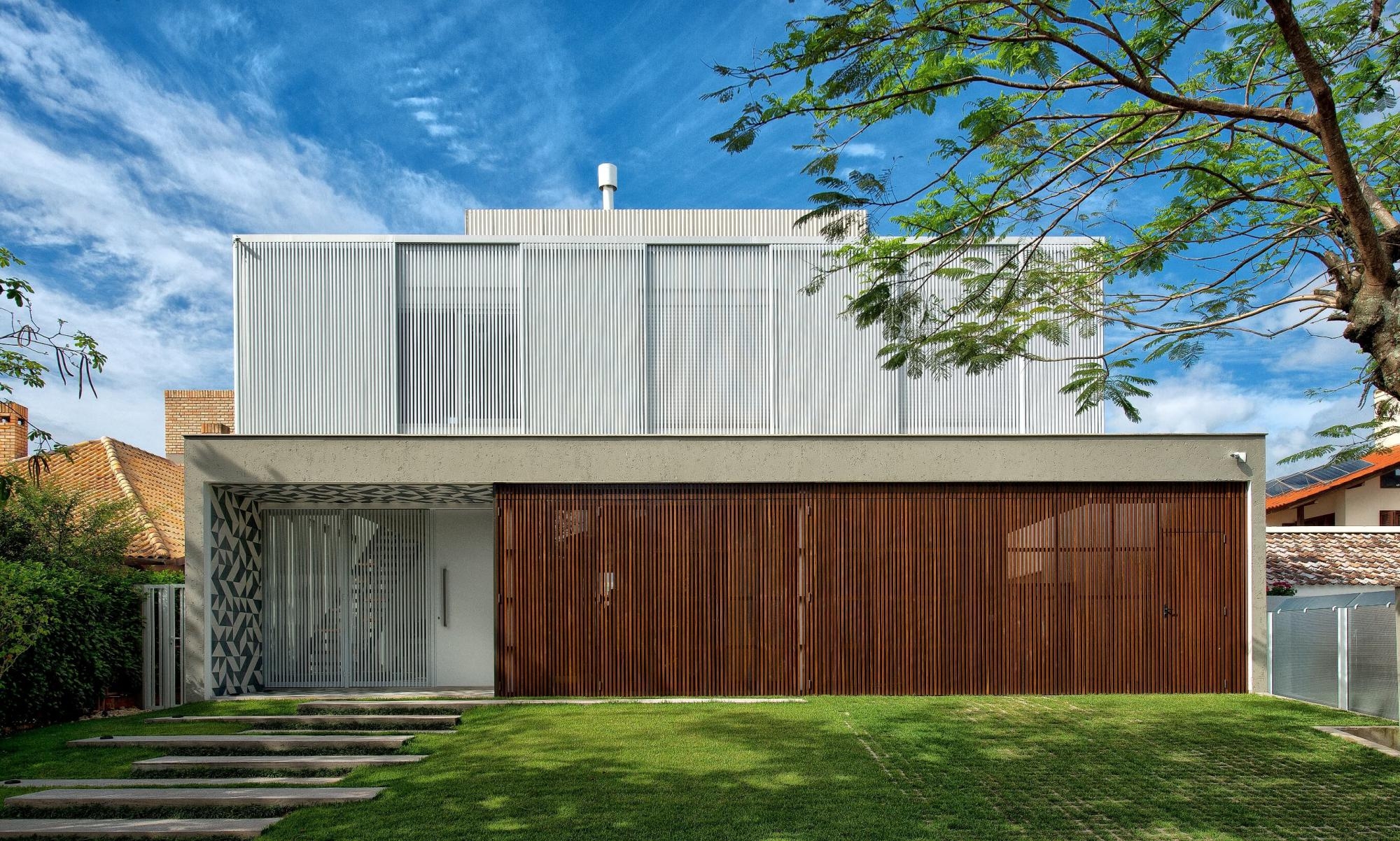 No piso térreo, as ripas são em madeira. Em frente às aberturas, esses ripados podem ser abertos, aumentando a entrada de sol.