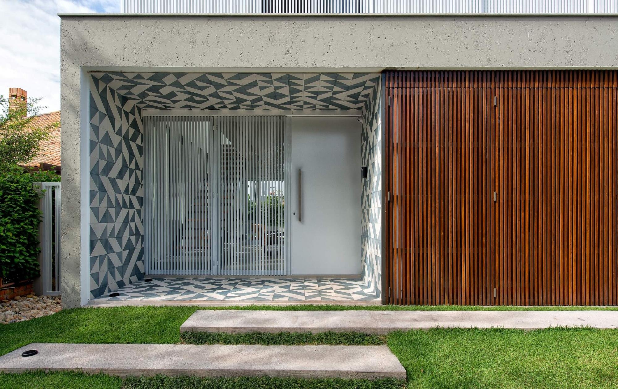 A arquitetura se completa com a adição de outras caixas destacadas, como o escritório no piso superior e a edícula nos fundos. Estas caixas receberam revestimento em ladrilho hidráulico para acentuar a sua independência da volumetria básica da casa. A referência para estes azulejos foram os painéis de Athos Bulcão, tão ricamente utilizados na arquitetura moderna brasileira.