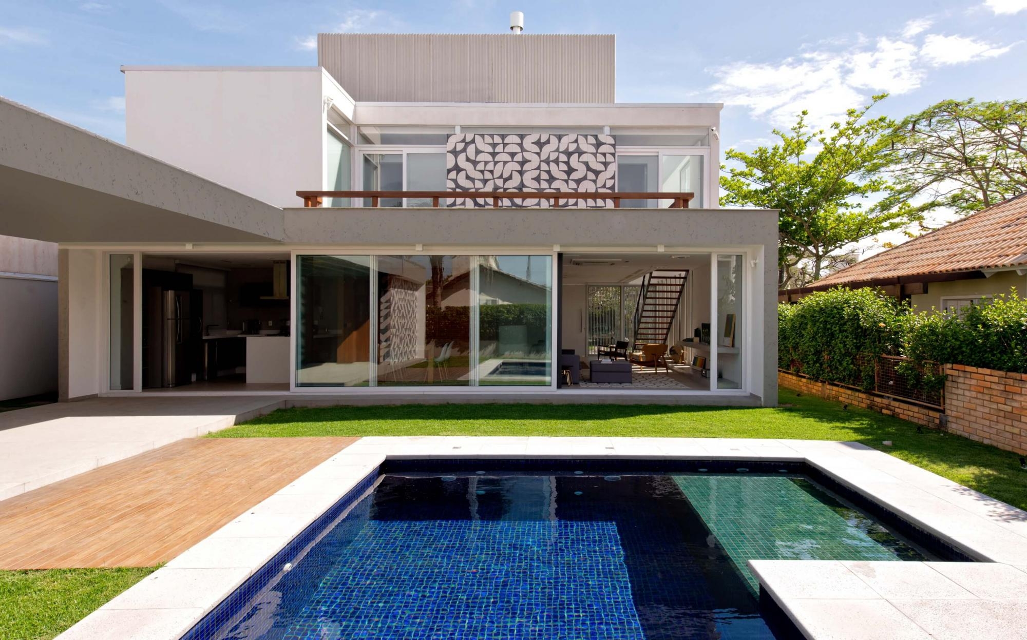 No térreo os ambientes de convívio se abrem para a piscina, afastada dos limites da construção para receber mais sol mesmo estando ao sul, nos fundos do terreno.