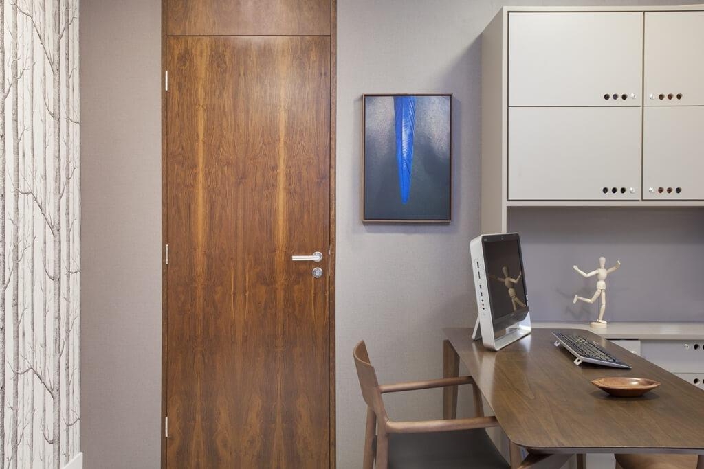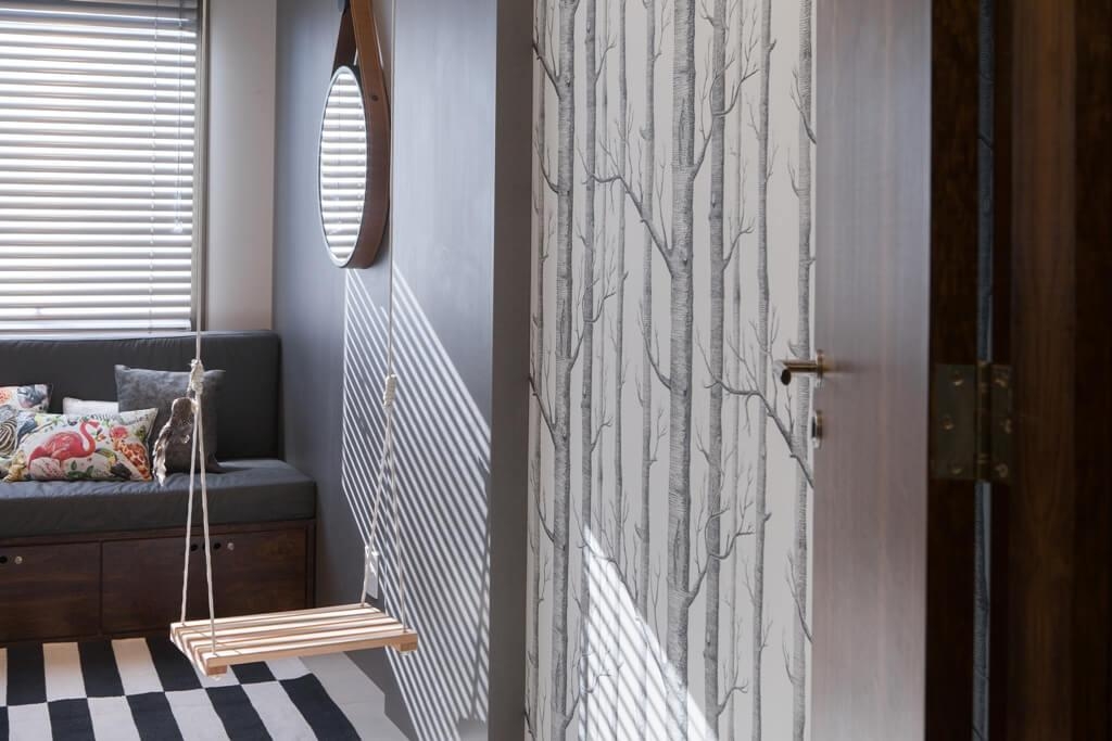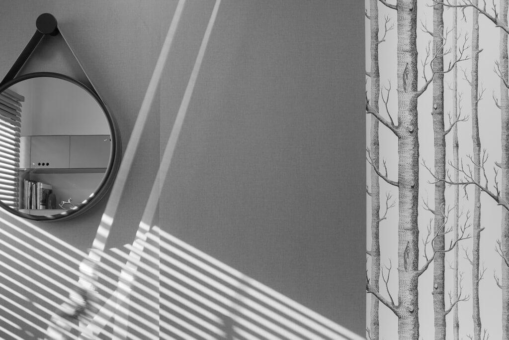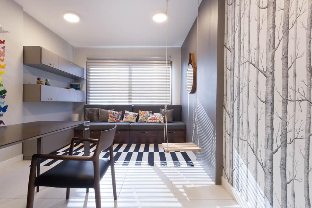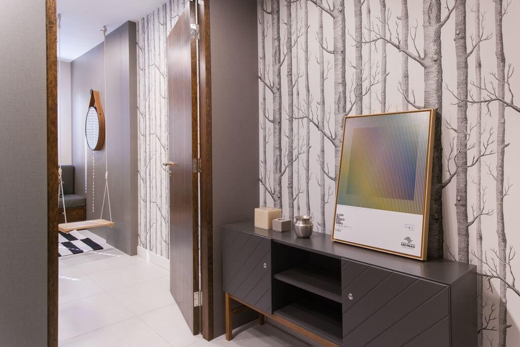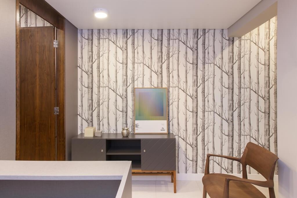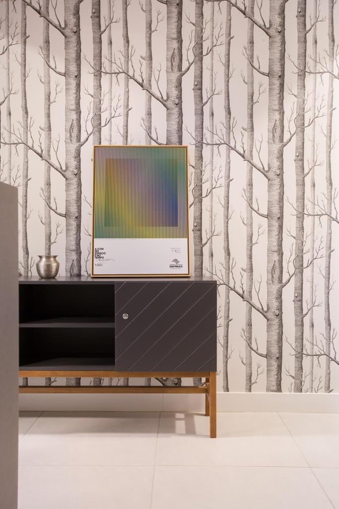 Estampa do papel sugerido pela cliente foi integrado às cores e texturas neutras do mobiliário.