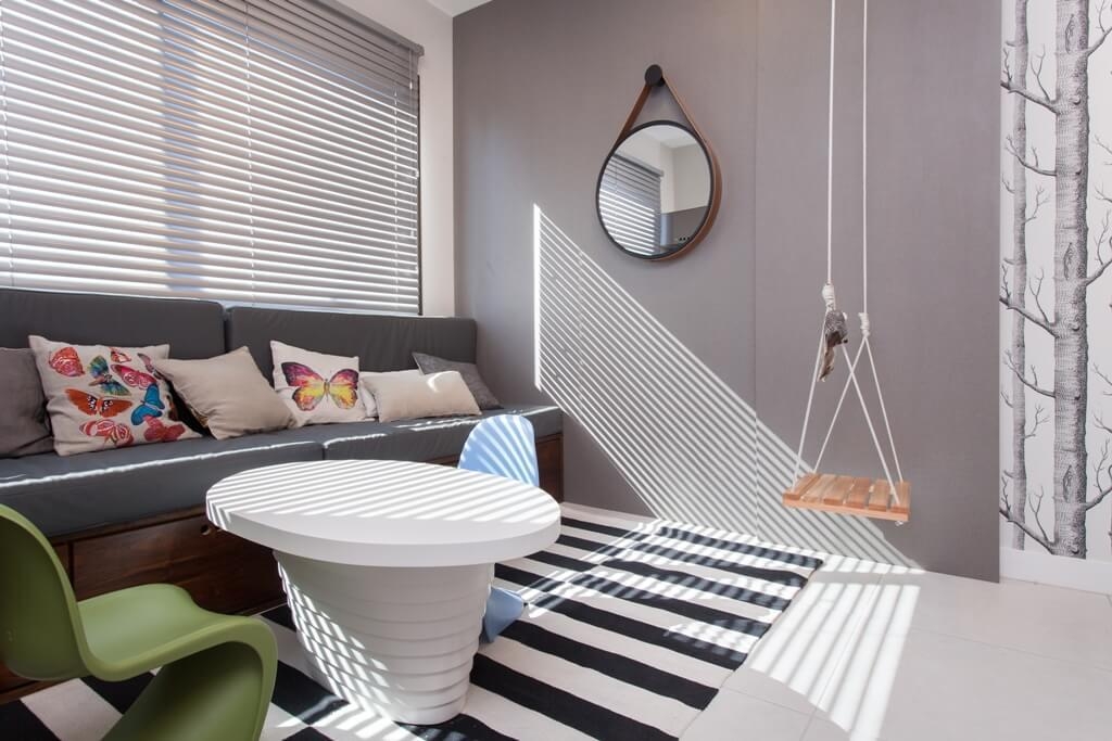 Sem a mesa circular central e suas cadeiras coloridas, a sala assume caráter mais adulto.