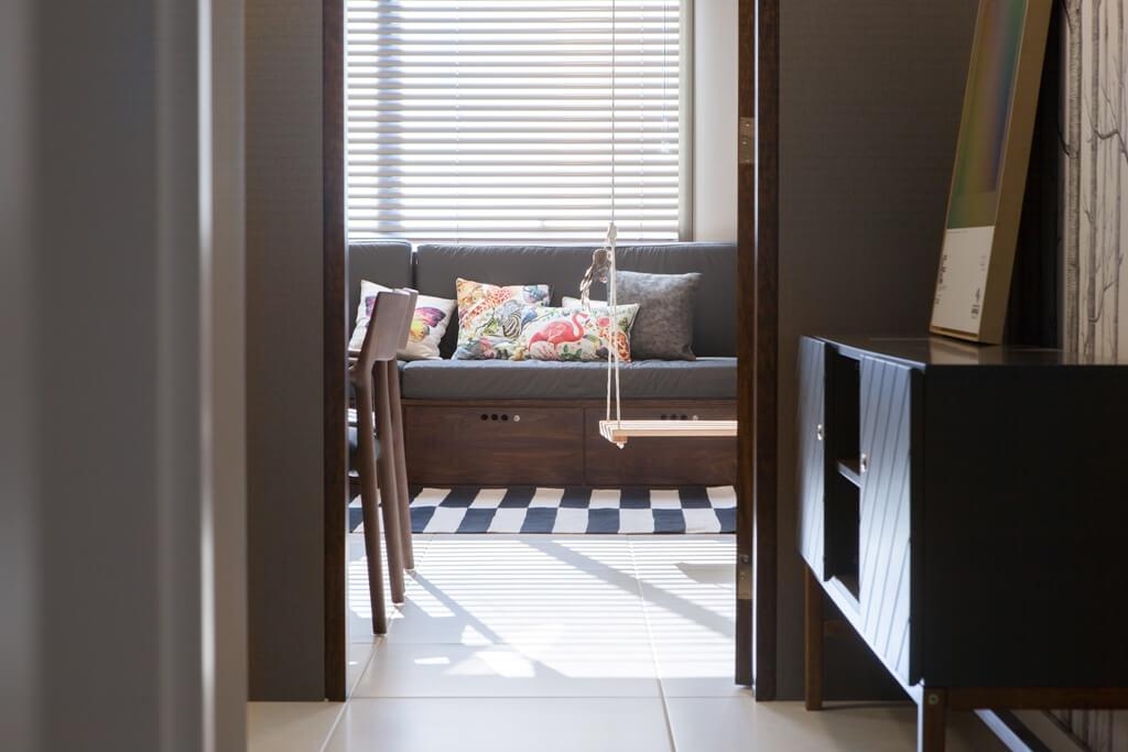 Visto desde a entrada, um balanço de corda e madeira recebe o cliente.